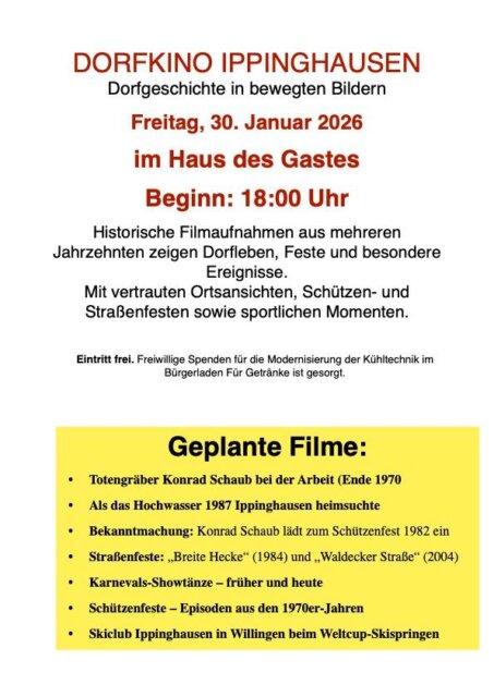 Das Programm bot eine kurzweilige Zeitreise durch die Dorfgeschichte. Gezeigt wurden alte Dorfaufnahmen aus den 1960er-Jahren, Filme über Schützen- und Straßenfeste als Herzstück des Dorflebens, ein sportlicher Ausflug zum Skiclub Willingen sowie ein humorvoller Rückblick auf den Karneval – von Maskenbällen bis zum Männerballett. Mit der Filmauswahl traf Manfred Homburg, der auch die Technik souverän im Griff hatte, genau den Nerv des Publikums. Der Wunsch nach einer Wiederholung im kommenden Jahr war vielfach zu hören.